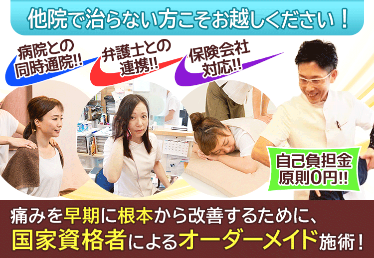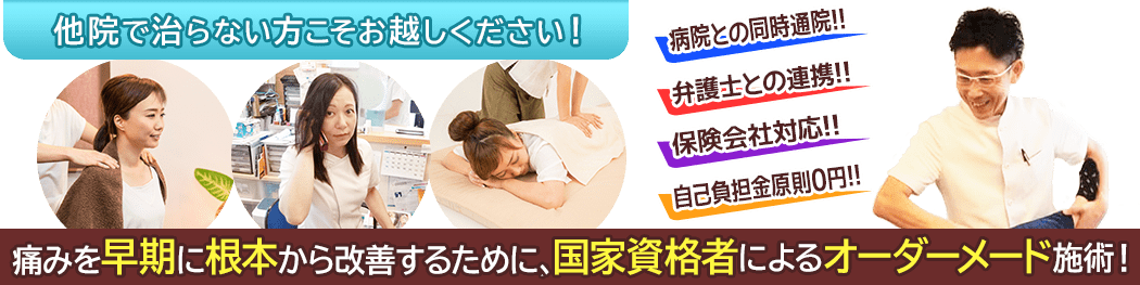 事故によるむちうちは接骨院で施術を受けていただくことが可能ですが、すべての接骨院がむちうち施術に詳しいというわけではありません。
